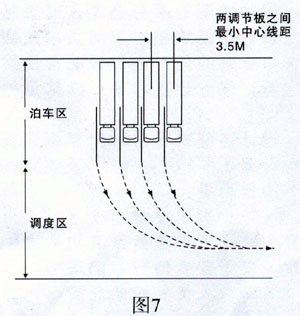 泊車位之間中心線距離建議應(yīng)至少3.5米,(圖7)如要考慮緊靠的兩輛車同時(shí)開啟車門,泊車位之間中心線距離最好為4米。平臺(tái)外圍區(qū)域的大小取決于泊位中以線間距離、貨車長(zhǎng)度及貨車的轉(zhuǎn)彎角度。同時(shí),如拖車裝卸貨時(shí),拖車頭會(huì)暫時(shí)脫離開貨柜/拖掛車,則所需平臺(tái)外圍區(qū)域可相應(yīng)減小,即該兩組數(shù)值成反比。