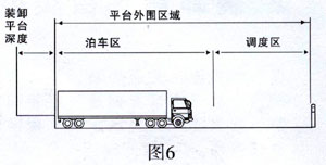平臺(tái)外圍區(qū)域指的是裝卸貨平臺(tái)前至圍欄區(qū)(或障礙物區(qū))之間可供貨車使用的區(qū)域。它應(yīng)包括裝卸貨時(shí)用于泊車的裝卸區(qū)及調(diào)動(dòng)貨車進(jìn)出裝卸區(qū)所必需經(jīng)過的調(diào)動(dòng)區(qū)(圖6、圖7)。