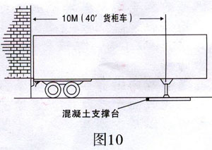 如泊車區(qū)地面沒有鋪設(shè)混凝土或鋪設(shè)的是瀝青、砂石,在平臺(tái)前適當(dāng)?shù)木嚯x,與平臺(tái)墻壁平行處,需鋪設(shè)堅(jiān)固的混凝土支撐臺(tái),當(dāng)拖車退靠在平臺(tái)前,拖車頭開走后,支撐貨柜(或車廂)前部的重量,(圖10)。標(biāo)準(zhǔn)40英尺貨柜車的支撐臺(tái)位距貨柜尾端約10米;20英尺貨柜車,此距離約為3.5米。支撐臺(tái)長(zhǎng)度如能一直延伸至平臺(tái)墻壁更佳,且要有足夠?qū)挾纫赃m應(yīng)不同車輛。為支撐滿載的貨車或有叉車開上的貨車,支撐點(diǎn)需有兩個(gè),相距1.8米,各能承重至少12噸, 有時(shí)為了更穩(wěn)固,當(dāng)拖頭馳離貨柜車時(shí),在拖掛車前端放置一活動(dòng)支撐臺(tái),用以減少叉車出貨柜時(shí)的沖擊力。