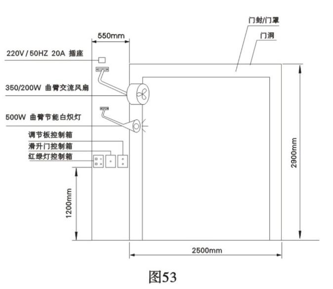 ● 土建時要求門洞內(nèi)側(cè)中的一側(cè)留有不少于5 5 0mm寬的平面安裝的位置,電源采用2 2 0 V / 5 0 H Z / 2 0 A的五芯電纜線(三根) 、三芯電纜線(兩根) 。(圖5 3、5 4)
