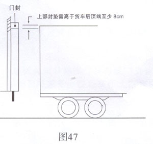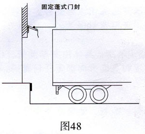 門封上部封墊的邊緣底需低于貨車后頂端至少8厘米(圖47)。門封上部封墊可根據(jù)貨車高度的需要而上下調(diào)整。平臺門較高且貨車高度范圍較大時,使用固定的垂簾形成蓬式門封代替上部封墊(圖48)。