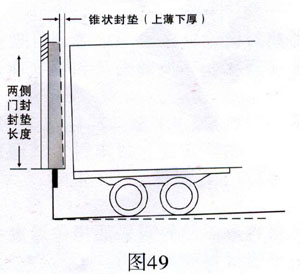 ● 裝卸區(qū)地面坡度大于2%時,應(yīng)使用錐壯封墊(圖49)。坡度每增加一個百分點,封墊頂部厚度比底部厚度應(yīng)小2.5厘米。