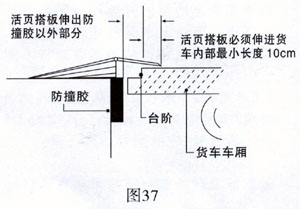 調(diào)節(jié)板前端的活頁搭板必須伸進(jìn)貨車內(nèi)部足夠長度以保證牢固可靠的支撐。根據(jù)美國國家標(biāo)準(zhǔn)學(xué)會MH14.1標(biāo)準(zhǔn),這一長度應(yīng)不短于10厘米(圖37)。