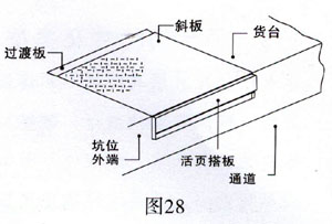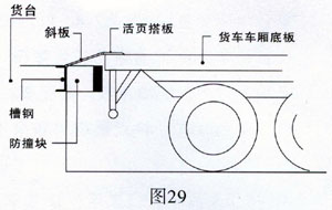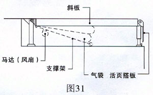 ● 低壓空氣動(dòng)力系統(tǒng)設(shè)計(jì)簡單(圖31)它利用一個(gè)與強(qiáng)力鼓風(fēng)機(jī)連接在一起的氣袋提升起斜板,斜板靠自身重量在下降時(shí)利用推桿推出搭板,搭在貨車車廂底板上。這種設(shè)計(jì)新穎,適合不同溫度地區(qū)。(氣袋作用只是提升斜板;不起任何承重作用)。