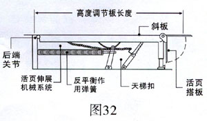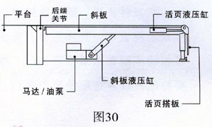 ● 液壓式調(diào)節(jié)板(圖30)由液壓系統(tǒng)產(chǎn)生動(dòng)力,提升起斜板。液壓式調(diào)節(jié)板噪音少、運(yùn)行平穩(wěn)、使用可靠,在歐、日、亞使用普遍,頗受歡迎。