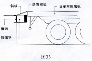 臺(tái)邊式調(diào)節(jié)板(EOD)成本低,但調(diào)節(jié)范圍小,僅在貨臺(tái)平面以上 1 2 . 5 cm至以下 1 2 . 5 cm,適用于貨車底板與平臺(tái)高度差距很小的情況且要注意裝卸工具(如叉車)底盤距地面空隙不可過小。(圖33)